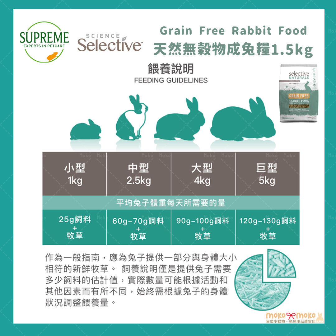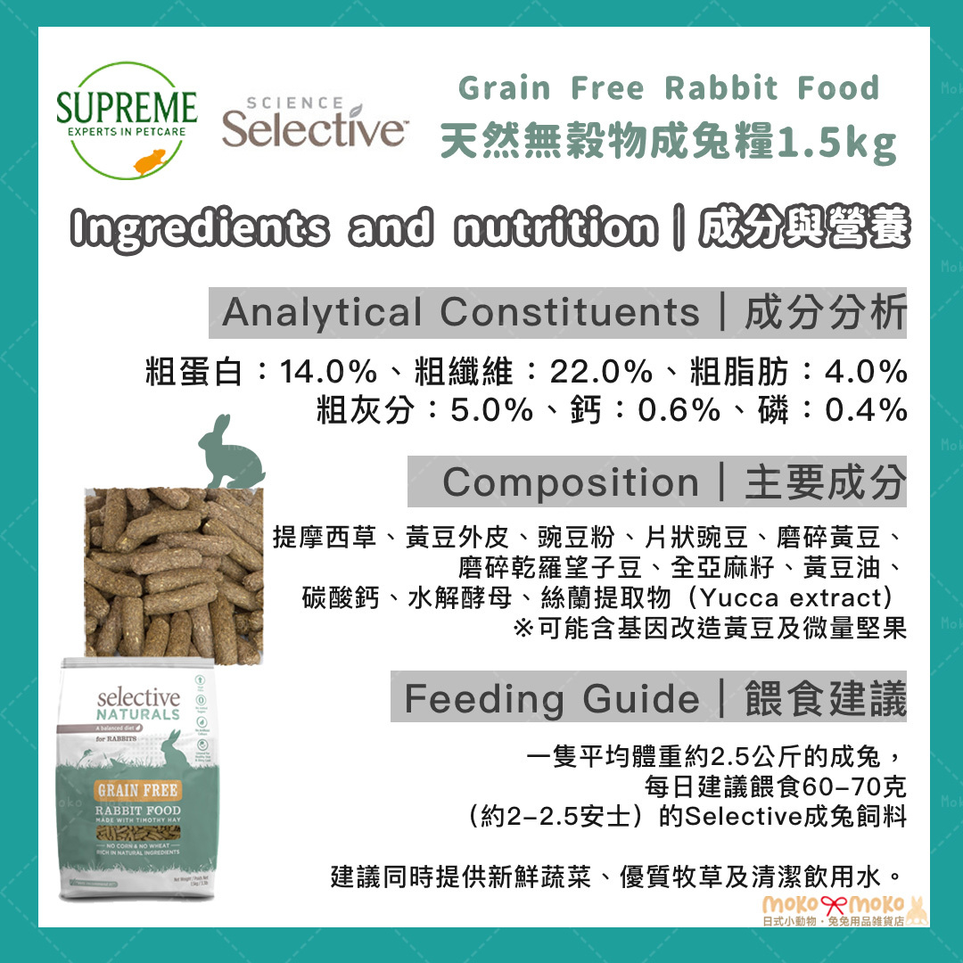 高纖無穀配方,加入天然提摩西草與健康蔬菜,貼近兔兔的天然飲食習慣。天然美味,兔兔愛不釋口!