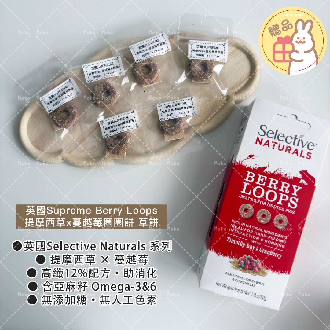 🍒Berry Loops以提摩西草與蔓越莓為主,由英國薩福克自家烘焙,高纖維(12%),支援牙齒健康與消化功能