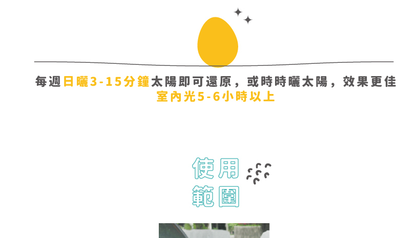 使用期限:本產品利用光線可還原其效能,一周建議日曬3-15分鐘,只要不摔破,則蛋體本身可永久使用。